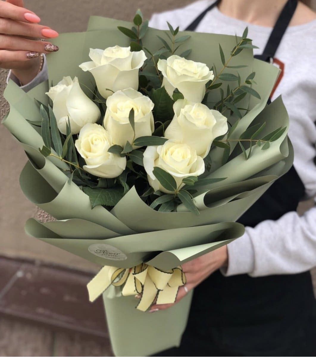 7 белых роз, фисташка, дизайнерская упаковка